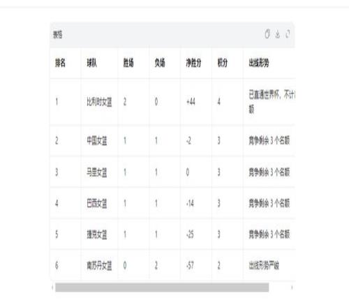 中國女籃暫時以1勝1負積3分-2淨勝分的成績,位居積分榜第二。第一名是2勝積4分的比利時隊。第三、第四、第五分是馬裏女籃、巴西、捷克,她們均積3分,淨勝分分別是0、-14、24。