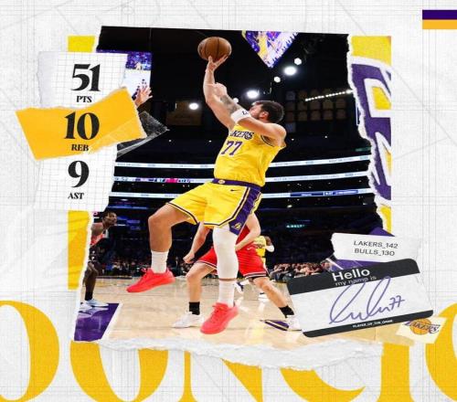 剩下1分44秒前,湖人再次被追到11分,然後東契奇造犯規,在罰球線上得到了個人第51分。