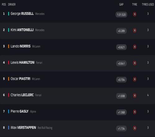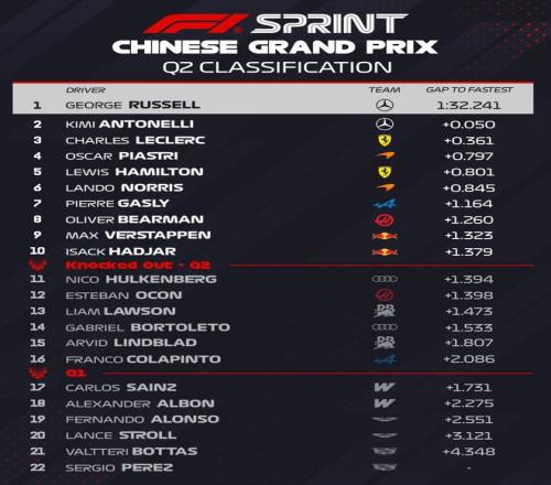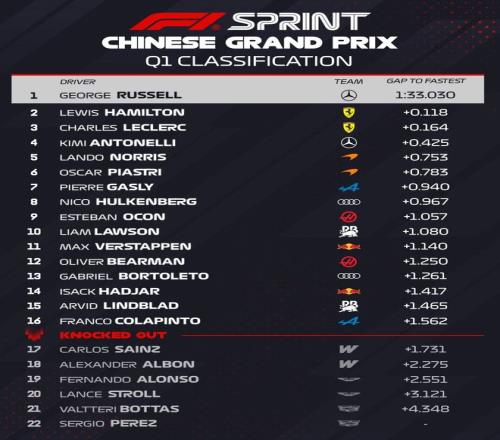 2026F1中國站衝刺排位賽今天下午結束爭奪,在一練表現亮眼的梅奔車隊徹底不演了,拉塞爾以1分31秒520獲得衝刺賽的杆位,安東內利排在第二,諾裏斯位列第三。諾裏斯與拉塞爾的差距達到了0.621秒,今年的梅奔兩台車實在是太快了……第四到第十依次是漢密爾頓、皮亞斯特裏、勒克萊爾、加斯利、維斯塔潘、比爾曼、哈賈爾。