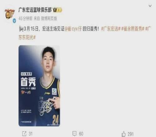 廣東隊官宣:崔永熙將在本月15日完成複出首秀。