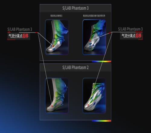 而在氣流形態的可視化畫麵中可以看到,包裹腳踝的護罩結構確實起到了作用:氣流從鞋麵流經腳踝時,不再是突然分離形成渦流,而是更平滑地過渡過去。鞋身圓潤的輪廓也讓氣流分離點後移,從而減少了後端壓強產生的阻力。