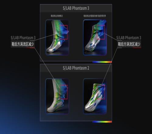 跑鞋進風洞,邏輯也一樣。Salomon把S/LAB Phantasm 3單獨放進風洞,模擬不同角度的空氣流動——因為人在跑步時,腳的角度一直在變,擺蕩過程中鞋麵以不同角度迎風。工程師需要通過這些不同角度的測試,看看氣流到底是怎麽經過這雙鞋的。