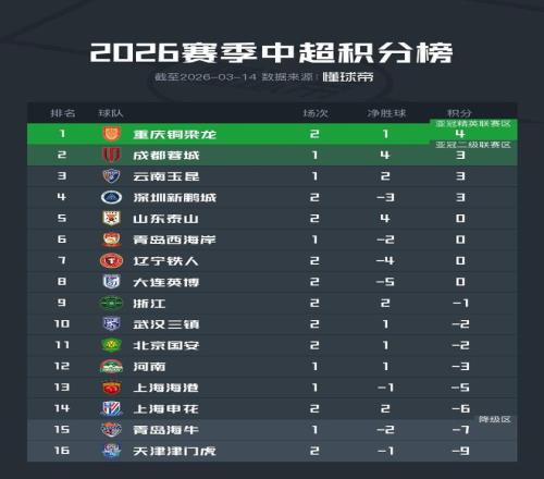實時積分榜上,銅梁龍兩輪1勝1平,積4分,暫列積分榜首位。少賽一輪的成都、雲南位列二三,西南地區三支球隊排名中超前三。