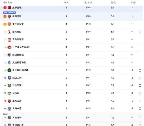 隨著這2場比賽結束,中超積分榜的形勢也發生巨大變化:1隊0分飆升到第四名,蓉城隊3分排名第一。