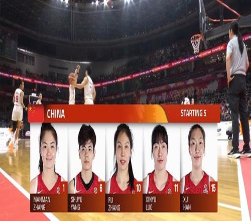 中國女籃首發為:中鋒韓旭,前鋒羅欣棫、張茹,後衛楊舒予、張曼曼。——中國隊變陣,讓張茹出戰增加防守強度。