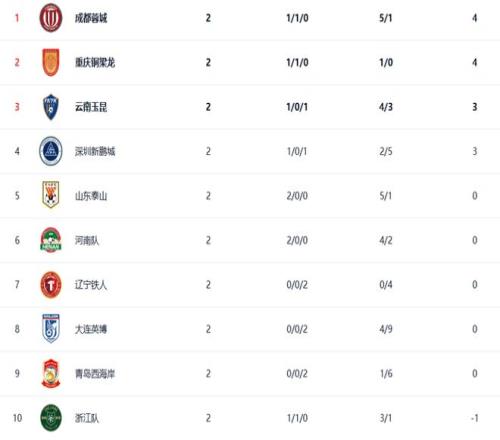 雲南玉昆、深圳新鵬城同積3分,分別排名第3、4位,山東泰山排名第5位。前兩戰一平一負的青島海牛(-6分)、天津津門虎(-9分)分居後兩位,一勝一平的上海申花則以-6的積分排名第14位。