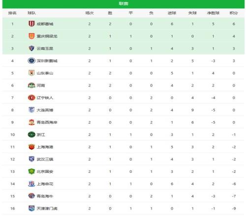 中超第二輪綜述及積分榜,泰山隊第5,成都領跑,四隊兩連敗