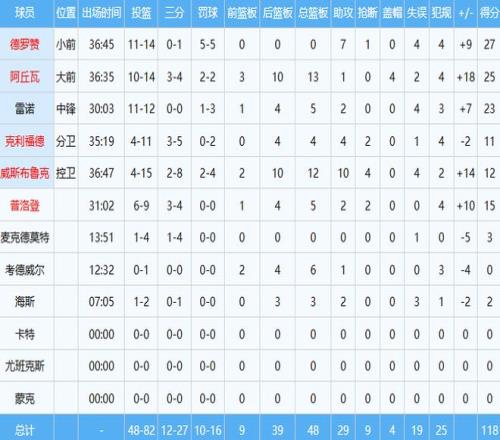 最終西部墊底的國王,在客場118-109爆冷擊敗快船,此役德羅讚進攻極其高效,投籃14中11,以約78.6%命中率貢獻27分外加7助;威少麵對老東家,12分12板10助三雙到手並且送出4次搶斷。