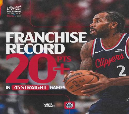 倫納德盡管隻打了不到26分鍾,可出手23次中13球砍下31分6板2斷,已經連續45場比賽得分20+創造快船隊史最長紀錄,之前該紀錄保持者為1972年榜眼秀鮑勃-麥卡杜。