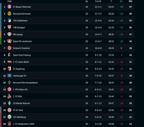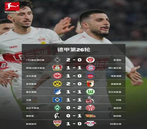 隨著北京時間3月16日淩晨進行的歐冠席位的關鍵爭奪戰中,斯圖加特1比0力克萊比錫,德甲第26輪全部比賽全部結束。被罰下2人的拜仁慕尼黑,在客場1比1艱難逼平勒沃庫森;而多特蒙德2比0擊退前來造訪的奧格斯堡,將與拜仁的分差縮小至9分;霍芬海姆戰平沃爾夫斯堡後積50分,而斯圖加特贏球後積分也來到了50分,因淨勝球劣勢屈居第四;RB萊比錫積47分排名第五,勒沃庫森積45分,本輪遺憾錯失了反超萊比錫的機會。