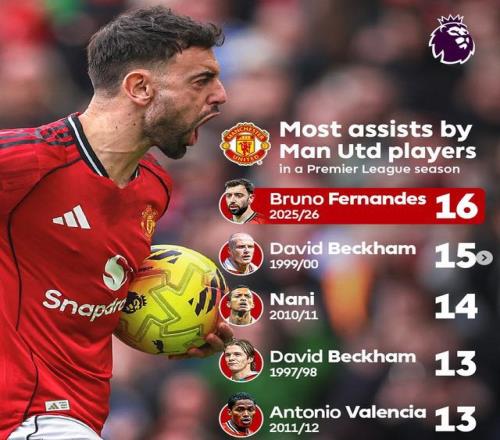 北京時間3月15日22點,25-26賽季英超第30輪曼聯3-1力克阿斯頓維拉,布魯諾-費爾南德斯送出兩記關鍵助攻,斬獲本賽季英超16次助攻,打破了由小貝保持26年的曼聯隊史單賽季英超助攻紀錄!