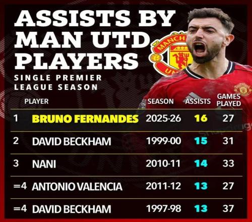 更值得一提的是,憑借助攻梅開二度,他也超越了曼聯隊內由小貝保持長達26年的英超15次助攻紀錄。在1999/2000賽季中,小貝貢獻了15次英超助攻,而現在B費的助攻次數達到16次。