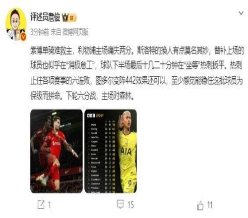 賽後,名嘴詹俊就公開質疑斯洛特的換人:有點莫名其妙,替補上場的球員也似乎在“消極怠工”,球隊下半場最後十幾二十分鍾在“坐等”熱刺扳平。