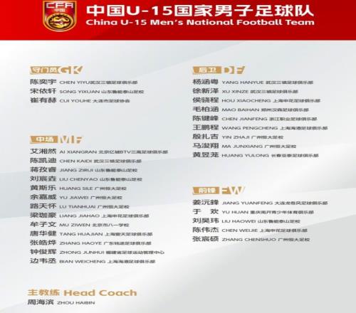 中國足協公布新一期U15國家隊名單,為做好2027年U17亞洲杯預選賽備戰工作,中國U-15國家男子足球隊定於2026年3月15日至4月1日赴上海市組織集訓。