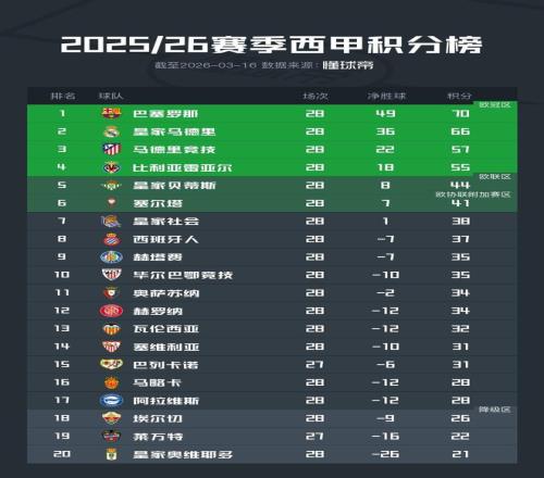 聯賽前28輪過後,在爭冠的兩支球隊中,巴薩以70分排名榜首,皇馬66分位列第二。目前前四名的競爭也較為明朗,馬競57分第三,比利亞雷亞爾55分第四,而排名第五的貝蒂斯則隻有44分。