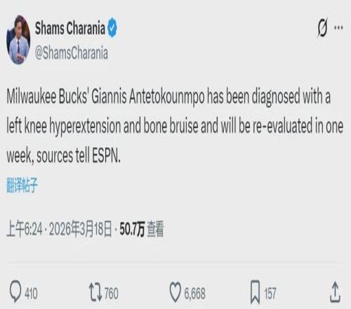 北京時間3月18日,據NBA名記Shams報道,雄鹿球星揚尼斯-阿德托昆博被診斷為左膝過度伸展和骨挫傷,將在1周後接受複查。常規賽僅剩3周多,如今雄鹿28勝39負僅排東部第11,落後第10黃蜂5.5個勝場,附加賽沒什麽希望了。