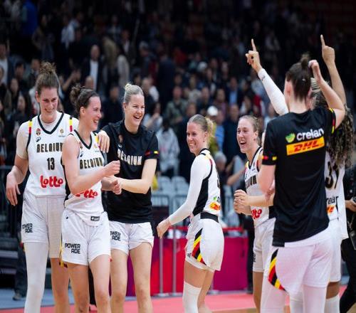 ↑3月12日,比利時隊球員賽後慶祝勝利。當日,在武漢舉行的2026年女籃世界杯資格賽A組比賽中,中國隊65:80不敵比利時隊。新華社記者 伍誌尊 攝