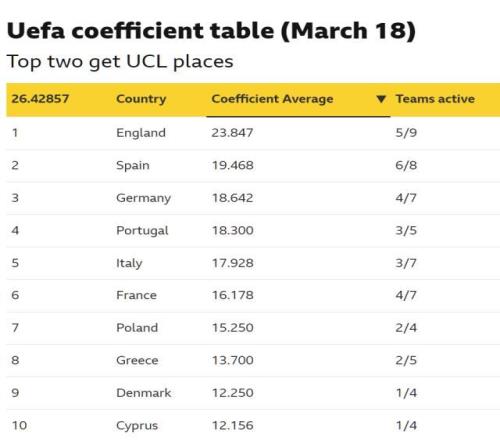聯賽階段紅紅火火6隊全部存活,到1/8決賽慘案不斷4隊出局,英超諸強在今年歐冠的大起又大落不能不說是個很熱鬧的話題。而這究竟是虛假繁榮還是時運不佳,這裏就不做細致的討論,隻講一個很現實的問題:在遭遇一番“血洗”之後,英超下賽季還能獲得那張額外的歐冠門票嗎?也就是英超究竟“前四踢歐冠還是前五踢歐冠”。正式答案目前還不能公布,但基本可以確定的是,英超繼續拿到5個名額問題不大。