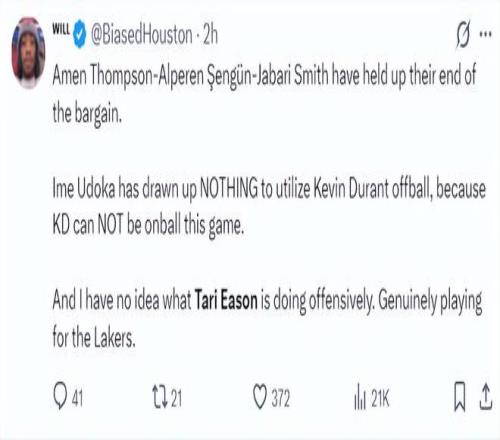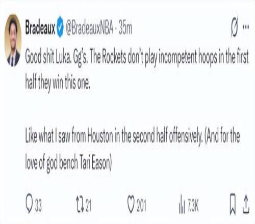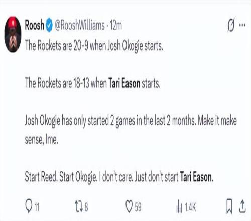 火箭記者Bradeaux:求求烏度卡,讓塔裏-伊科回替補席去吧。