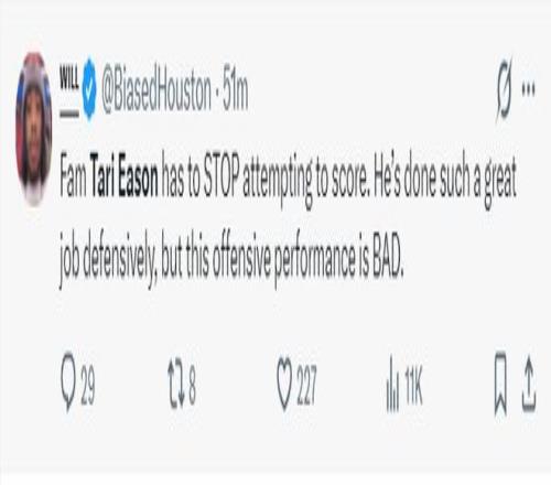 塔裏-伊森又成為火箭輸球的罪人,對陣湖人的二番戰,他全場比賽32分鍾,13中4,三分3中0,拿到10分6籃板1助攻1搶斷1蓋帽2失誤,命中率30.87%,三分命中率0%,在末節他還有兩次胡亂的中投進攻。