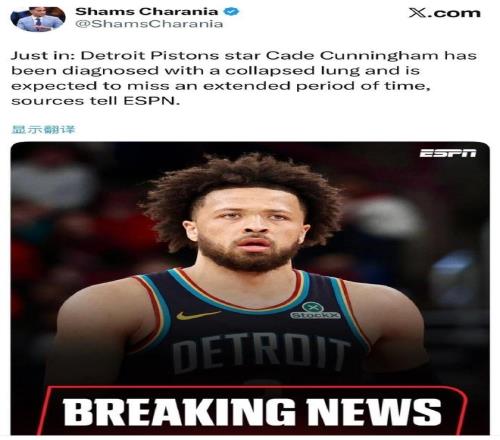 北京時間3月19日,東部第一活塞遭遇重創,根據ESPN名記Shams Charania報道,坎寧安被診斷出患有氣胸,預計將缺席很長一段時間,對於活塞在常規賽衝刺階段會是極為不利的消息,也很可能讓坎寧安失去評獎資格。