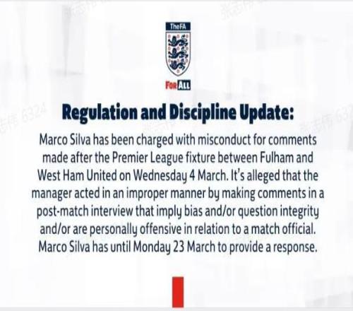 北京時間3月20日,英格蘭足球總會官方發表公告,富勒姆主教練馬爾科-席爾瓦因在對陣西漢姆聯的賽後對裁判發表不當言論被指控,需在3月23日前就相關指控作出回應。