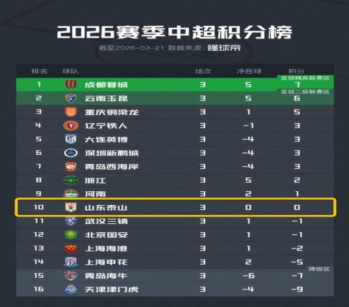 中超第3輪,山東泰山客場0-4完敗雲南玉昆,3輪過後積0分,淨勝球歸0。