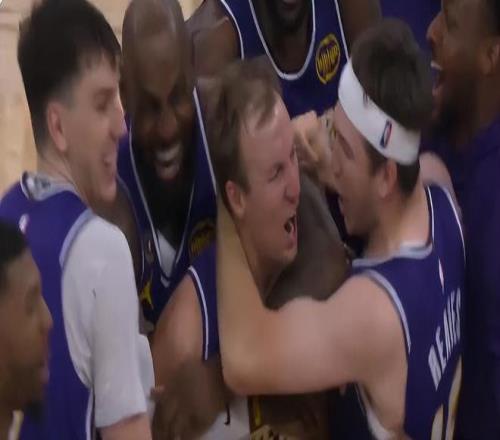 在肯納德完成三分絕殺後,詹姆斯衝上來抱著肯納德不肯防守,大家可以看到詹姆斯的臉都快笑爛了,別提41歲的老頭子有多開心了。