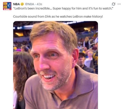 名宿諾維茨基此役到場觀戰,他談到勒布朗加冕曆史出場王:詹姆斯真的太不可思議了,為他感到超級開心,看他打球也很有趣。