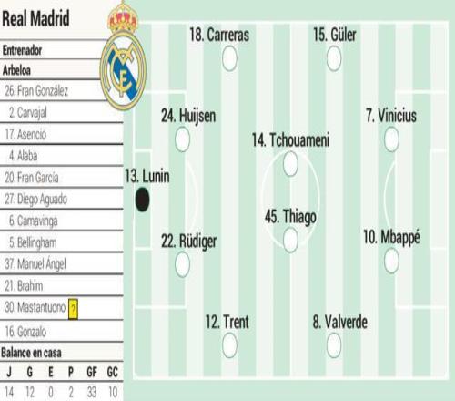 皇馬預計首發十一人: 盧寧 / 特倫特、呂迪格、懷森、卡雷拉斯 / 巴爾韋德、蒂亞戈、楚阿梅尼、居萊爾 / 姆巴佩、維尼修斯