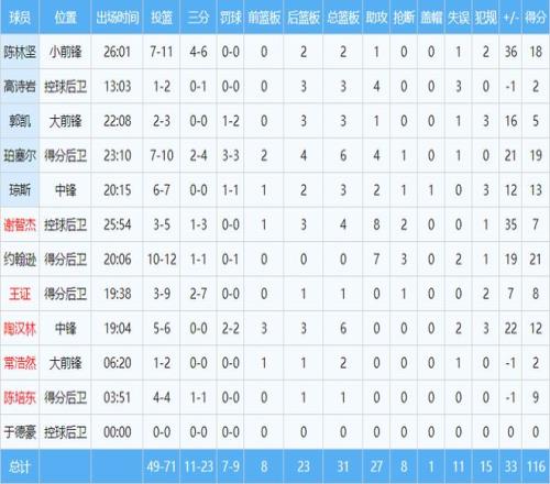 本場比賽,山東隊共有11名球員出場,全部有得分進賬,其中有5人得分上雙。約翰遜12投10中,高效砍下全場最高的21分和7助攻3搶斷。珀塞爾貢獻19分6籃板4助攻的全麵數據。陳林堅三分球6中4,得到18分。瓊斯13分,陶漢林12分6籃板。小將王證得到8分,常浩然2分2籃板。