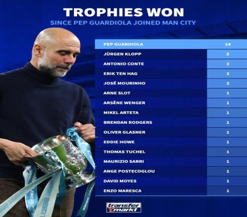 北京時間3月24日,在曼城擊敗阿森納贏得本賽季聯賽杯冠軍之後,來自德轉的統計指出,自瓜迪奧拉2016年7月接手曼城以來,這位西班牙名帥已經率隊14次贏得冠軍獎杯,這一數據領先於同期所有在英超有過執教經曆的主帥。