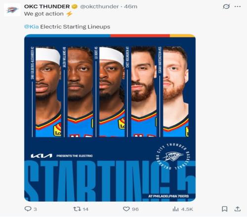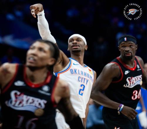 次節雷霆的第二陣容都吊打費城的第一陣容,麥凱恩登場時費城球迷為他響起歡呼聲,這是他被交易到OKC後首次回到費城主場打球。替補席的傑林2分鍾裏命中三個三分球拿到9分,單節雷霆一波30-18打崩費城,SGA半場隻拿到11分2籃板2助攻但分差已經是20+。