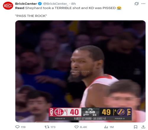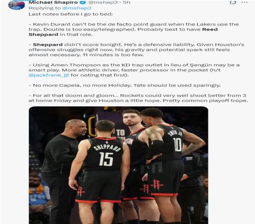 火箭隊記邁克爾0沙普爾寫道:湖人采取包夾杜蘭特的戰術,而火箭用KD當主要控球手,KD破包夾的能力不足,我覺得不如給謝潑德更多持球的角色。